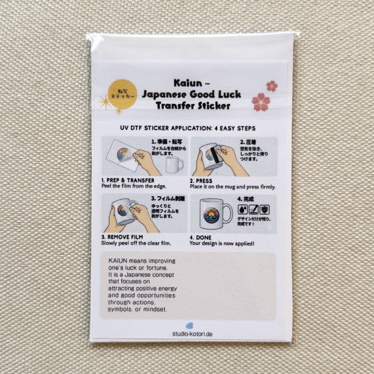 Good Luck Transfer Sticker „Kansha“ – Dankbarkeit 2026 1/07 6,50 € inkl. 19 % MwSt. plus Shipping Costs 1 vorrätig Good Luck Transfer Sticker „Kansha“ - Dankbarkeit Menge In den Warenkorb Artikelnummer: OI-24007 Kategorien: Hausmade, japan kollektion Schlagwort: japan Produktsicherheit Produktsicherheit Ähnliche Produkte Good Luck Mini Klappkarte „Fuku“ – Reiches Glück 3,00 € inkl. 19 % MwSt. plus Shipping Costs In den Warenkorb Klappkarte Ukiyo-e „Tamakazura“ 6,50 € inkl. 19 % MwSt. plus Shipping Costs In den Warenkorb Klappkarte Ukiyo-e „Unter der Mannen- Brücke in Fukagawa“ aus „36 Ansichten des Berges Fuji“ 6,50 € inkl. 19 % MwSt. plus Shipping Costs In den Warenkorb Kleinbox, Fest am Inari Schrein 7,50 € inkl. 19 % MwSt. plus Shipping Costs In den Warenkorb Good Luck Transfer Sticker „Fukuju Enman“ - Glück und langes Leben in Harmonie Good Luck Transfer Sticker „Yūki“ - Tapferkeit