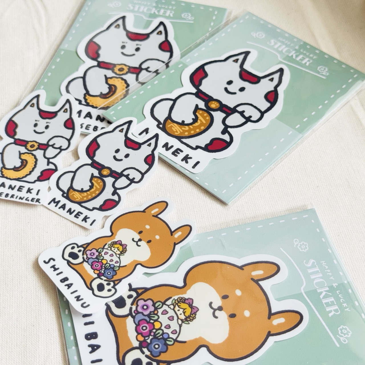Illustrations-Sticker im japanischen Stil – Maneki-neko, die Süßigkeiten anzieht.